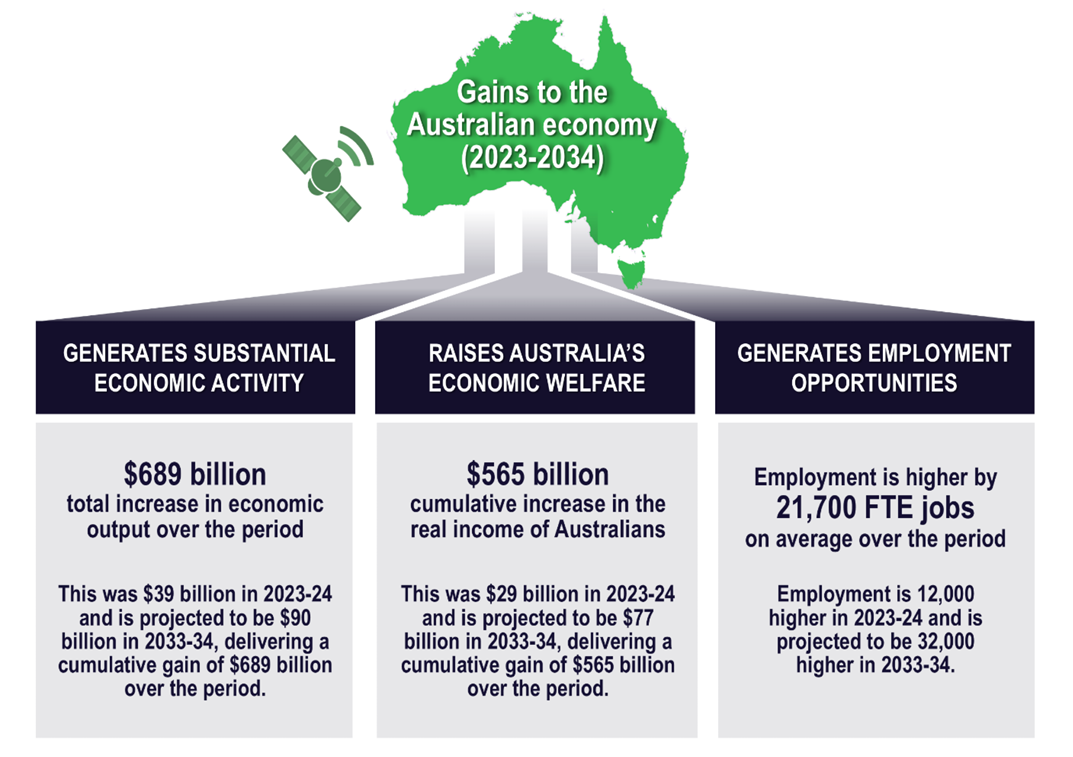 Over the next decade, the economic impacts in terms of economic activity, economic welfare and the employment opportunities generated are significant (see figure below). The undiscounted impact on economic output is projected to be AUD 689 billion over the period and the impact on real income is projected to be AUD 565 billion over the same period. Employment is projected to be higher by 21,700 FTE jobs on average over the period.