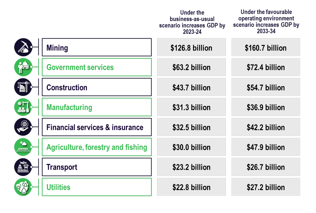 The sector in 2023-24 will contribute an additional AUD 39 billion to Australian GDP and over 12,000 jobs. By 2033-34, it is projected that the contribution could be an additional AUD 90 billion in GDP, and an additional 32,000 jobs, assuming a favourable operating scenario.