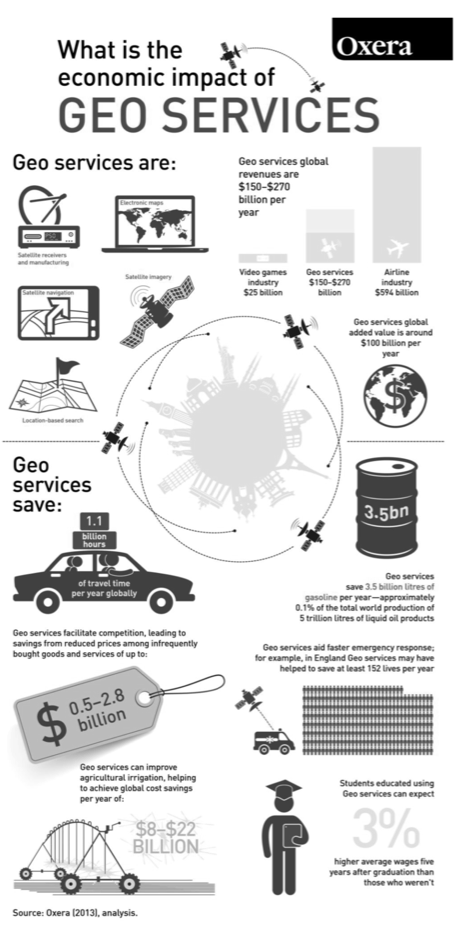For this study geo-services are defined as all interactive digital mapping and location-based services. These include providers of satellite imagery, digital maps, satellite positioning signals, and navigation devices. Digital maps are defined to include both online maps and locally stored maps (such as satellite navigation systems used in cars). Traditional hard copy map publishers are not included in the estimates.